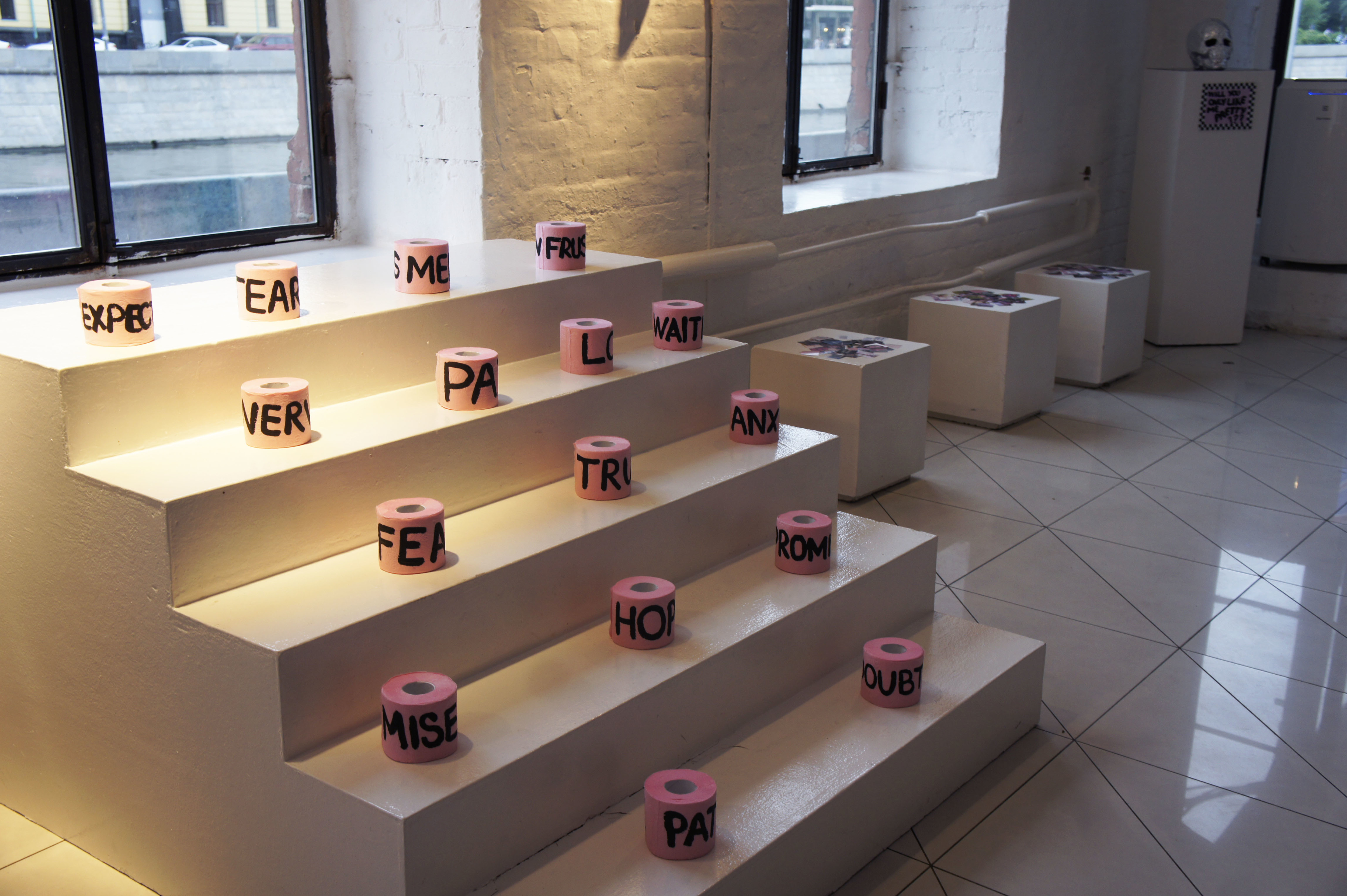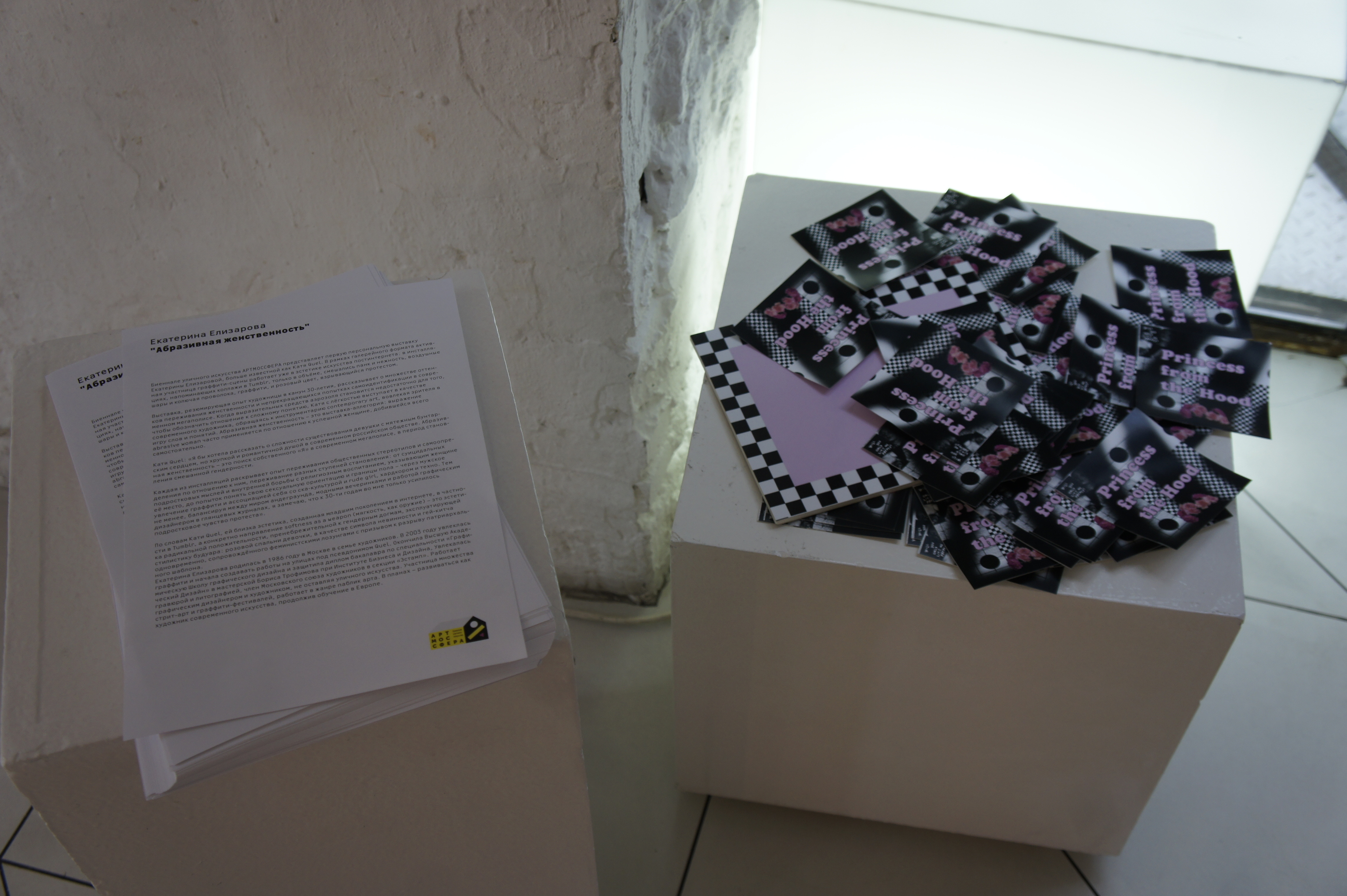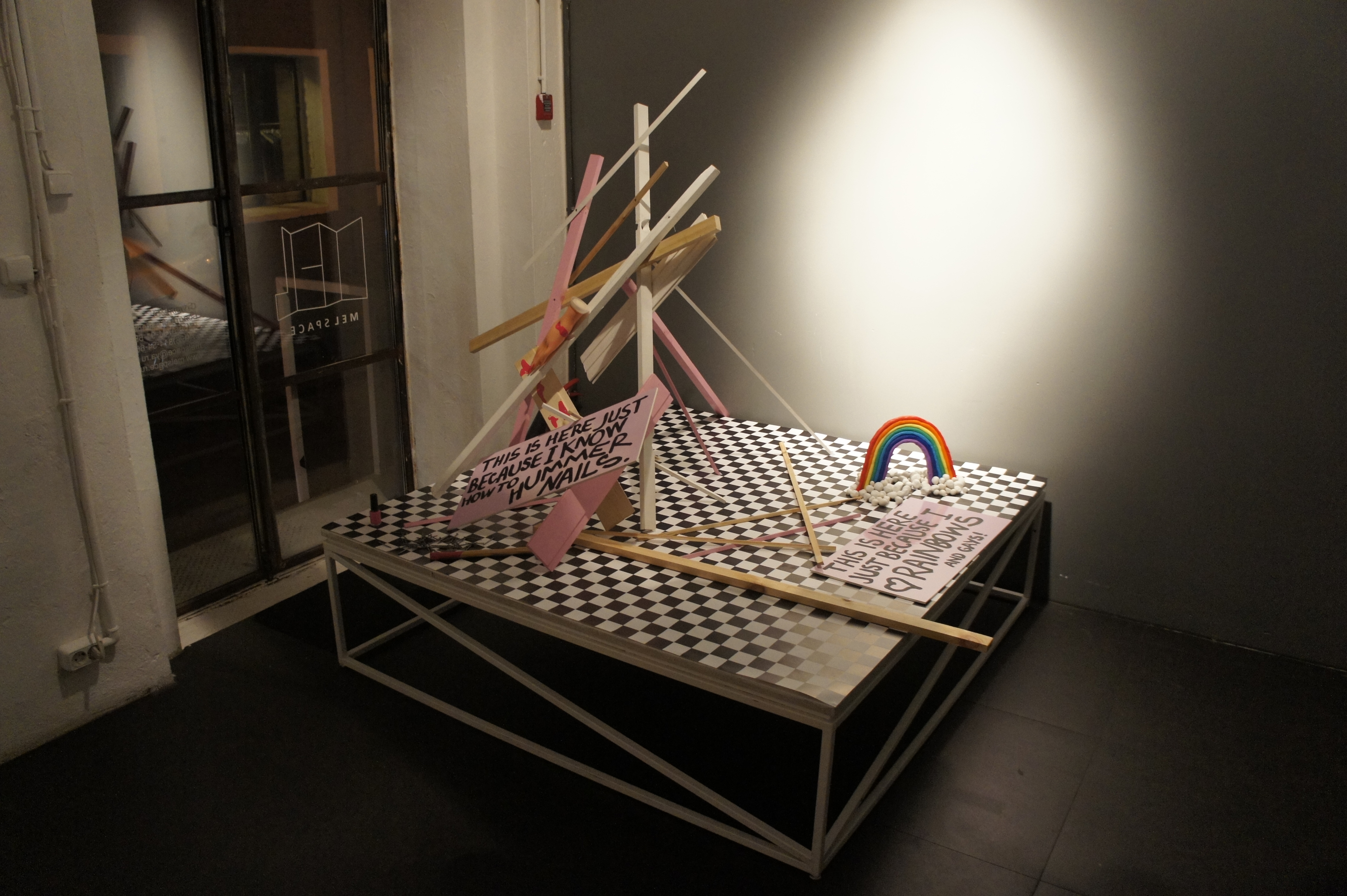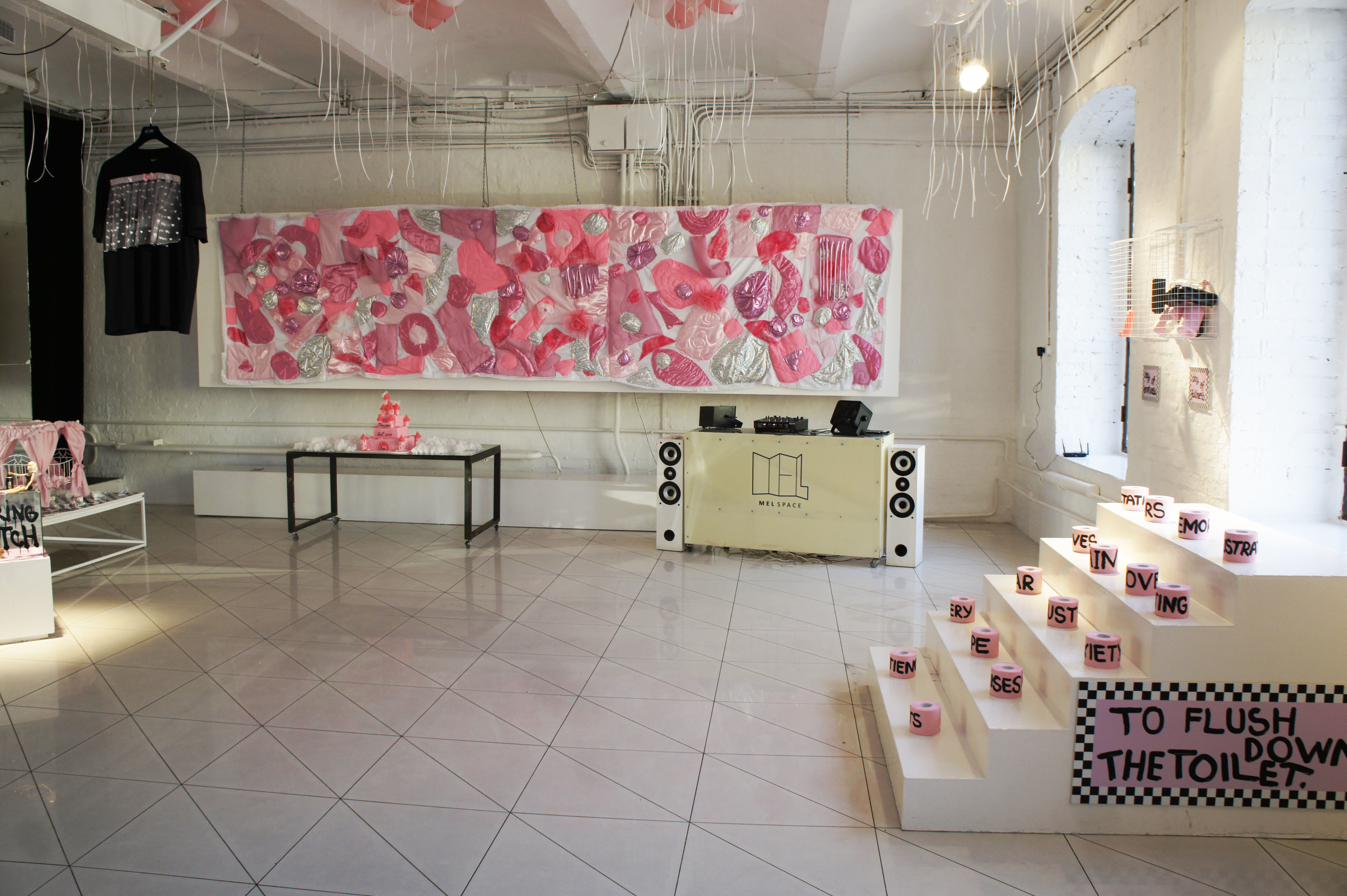 The exposition shows a series of works created especially for the exhibition in 2016. Each object reveals some personal experiences and internal problems of the artist. The works mix tenderness and kitsch with graffiti punk style. Quel: Β«The aim of the exhibition is to find yourself in the modern world, in reality in Moscow in that period of the formation of mixed gender, through the honest disclosure of my relationship to the world through objects. Having a lot of life stages of adolescent from the sucidal thoughts in the inner struggle with religious upbringing that demeans women; through the attempt to understand my own sexual orientation; through the male fascination with painting graffiti on trains; through associations myself with a ska rude girl; through hardcore and techno parties; through the jobs in glossy magazines and attending glamorous parties; through the interest in the last fashion trends, in contemporary arts and the Internet community, to 30 years, strangely enough, I only feel the increasing of teenage sense of protest in me. I notice that things around me and my personal outlook becomes closer to aesthetics of the younger generation who grown up in Vkontakte and Tumblr. I really appreciate a new aesthetics that called "softness as a weapon". This aesthetics is radically in the mood and disparages gender dogmas but it uses the style of pink girlish boudoir, an innocent victim, and gay kitsch coupled with feminist slogans and calls to break the patriarchal pattern. Within the framework of this exhibition, I would like to talk about the complexity of existence in the Russian society a girl with a rebellious heart, but fragile and romantic soul."