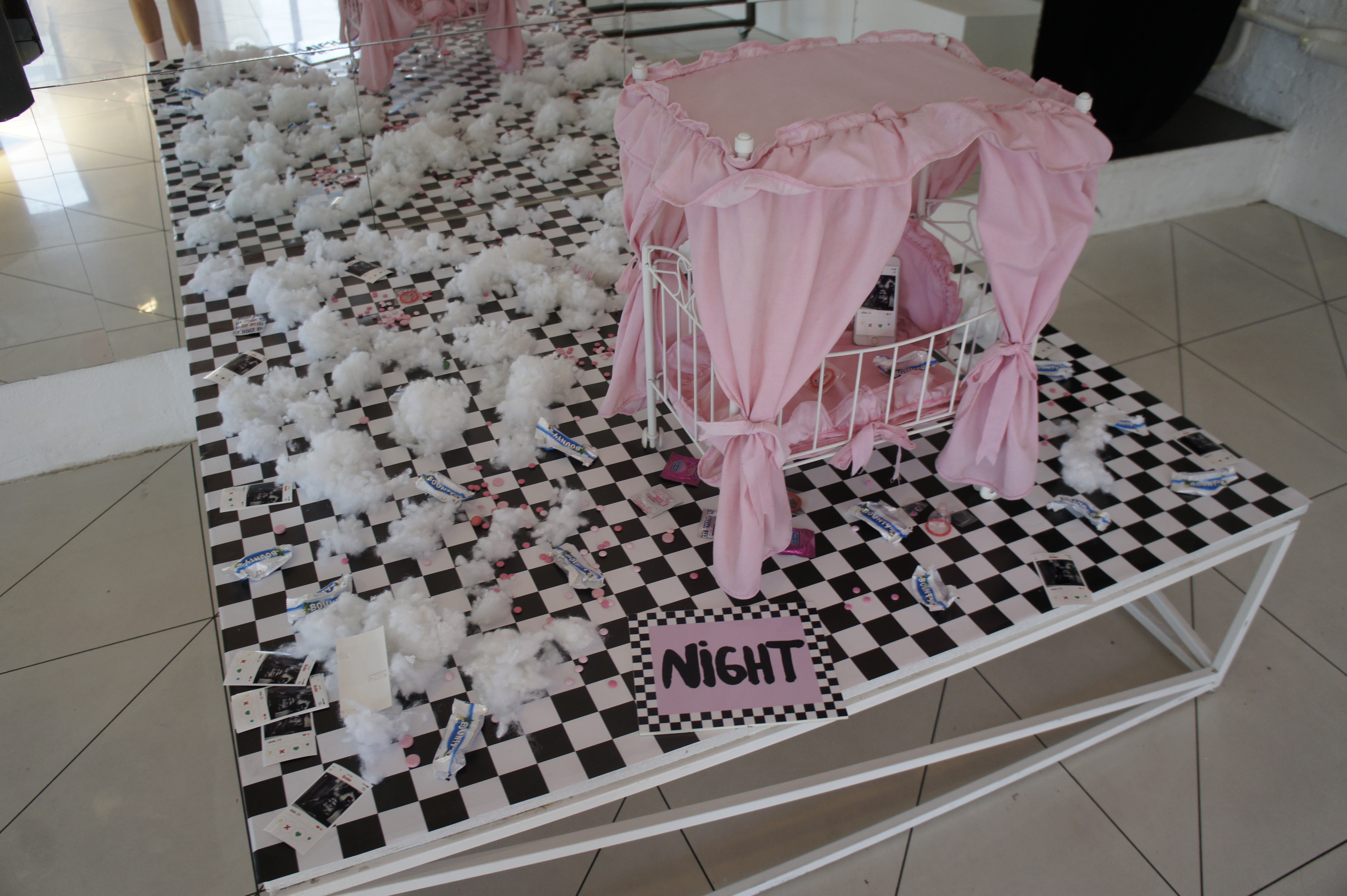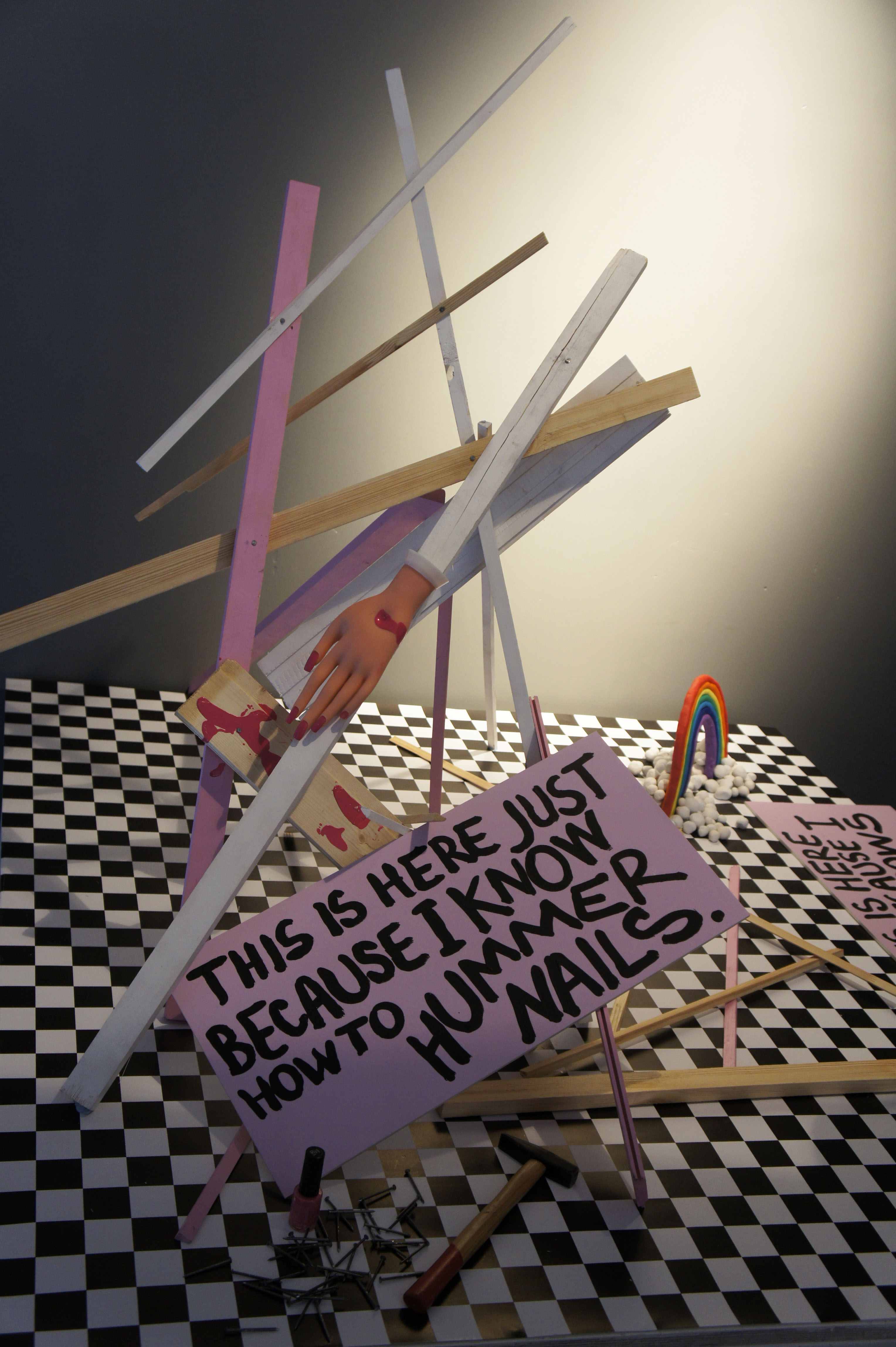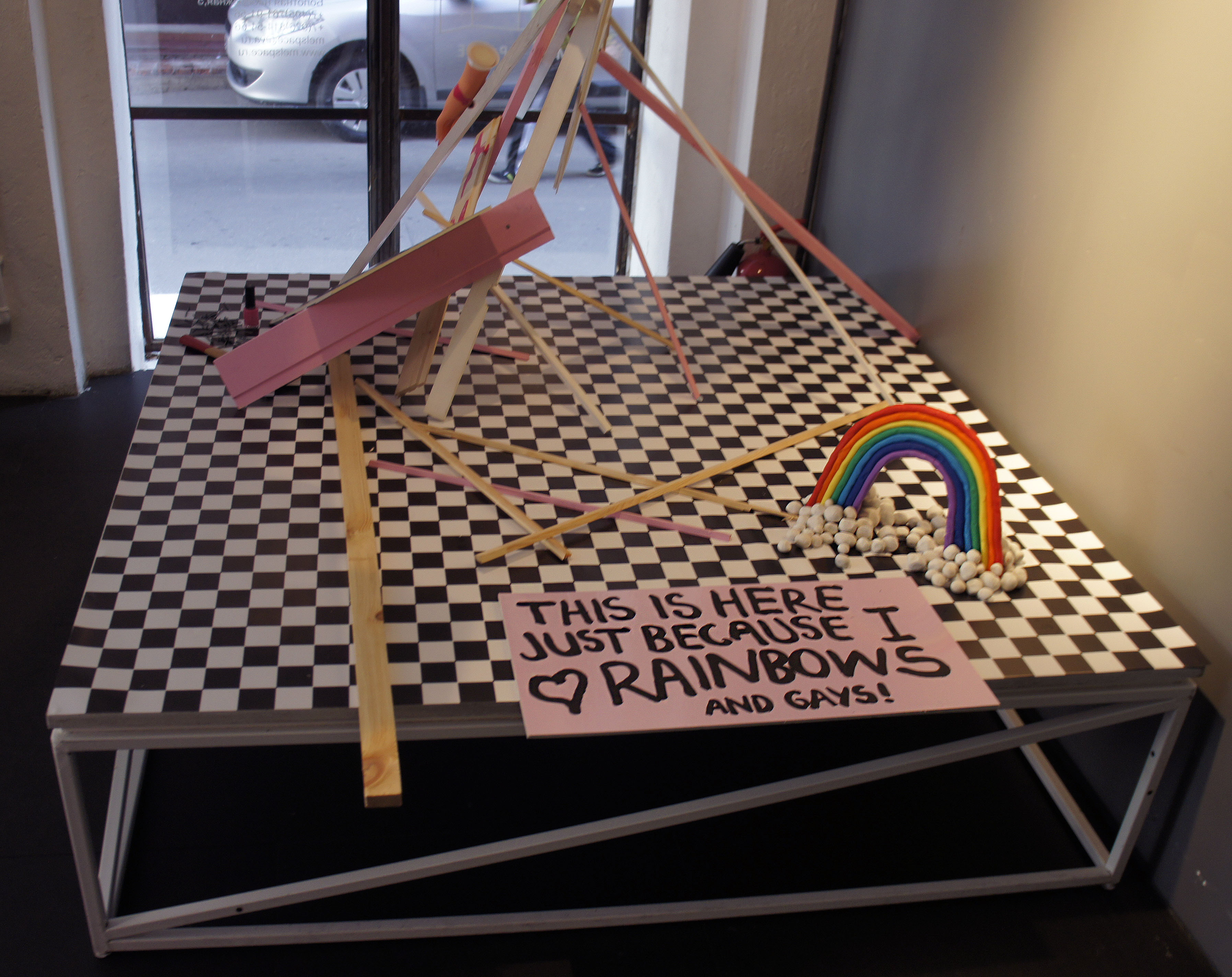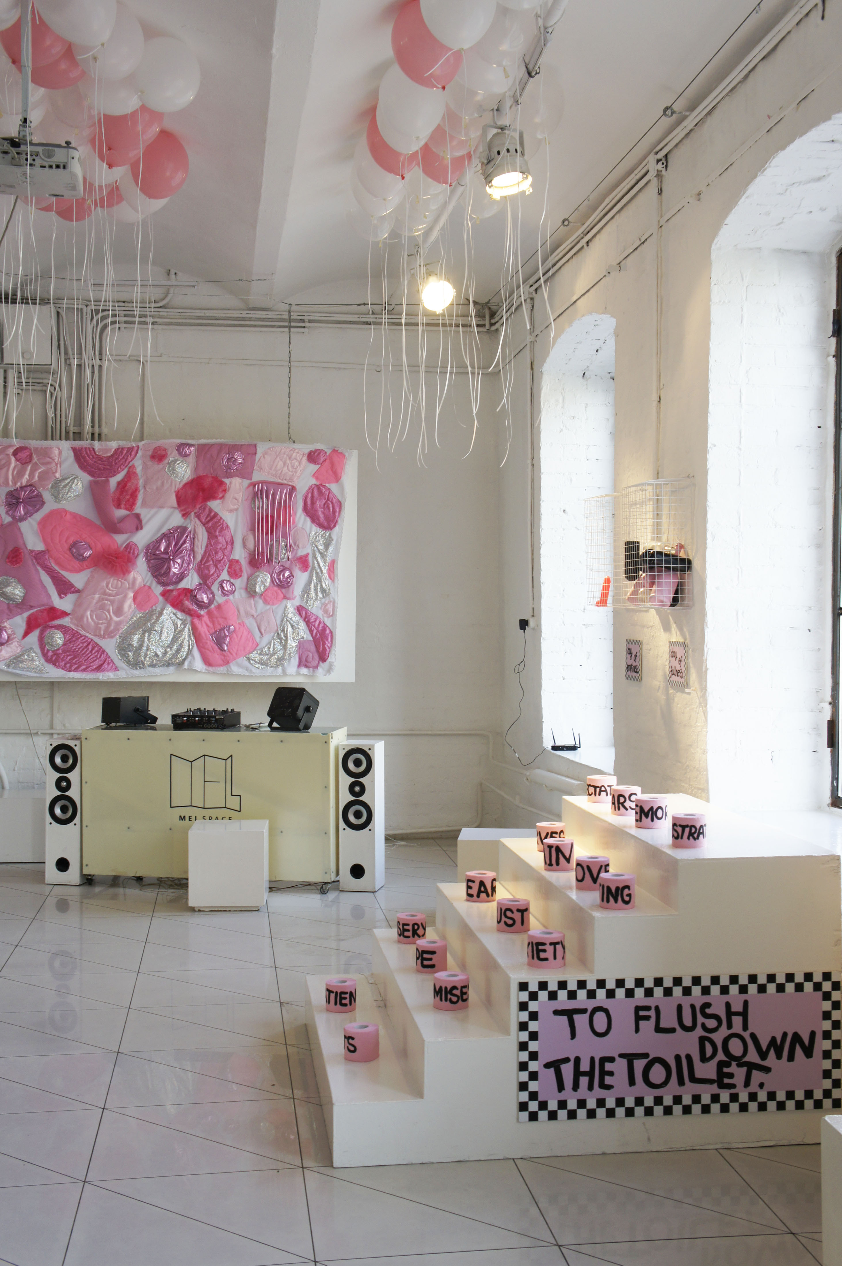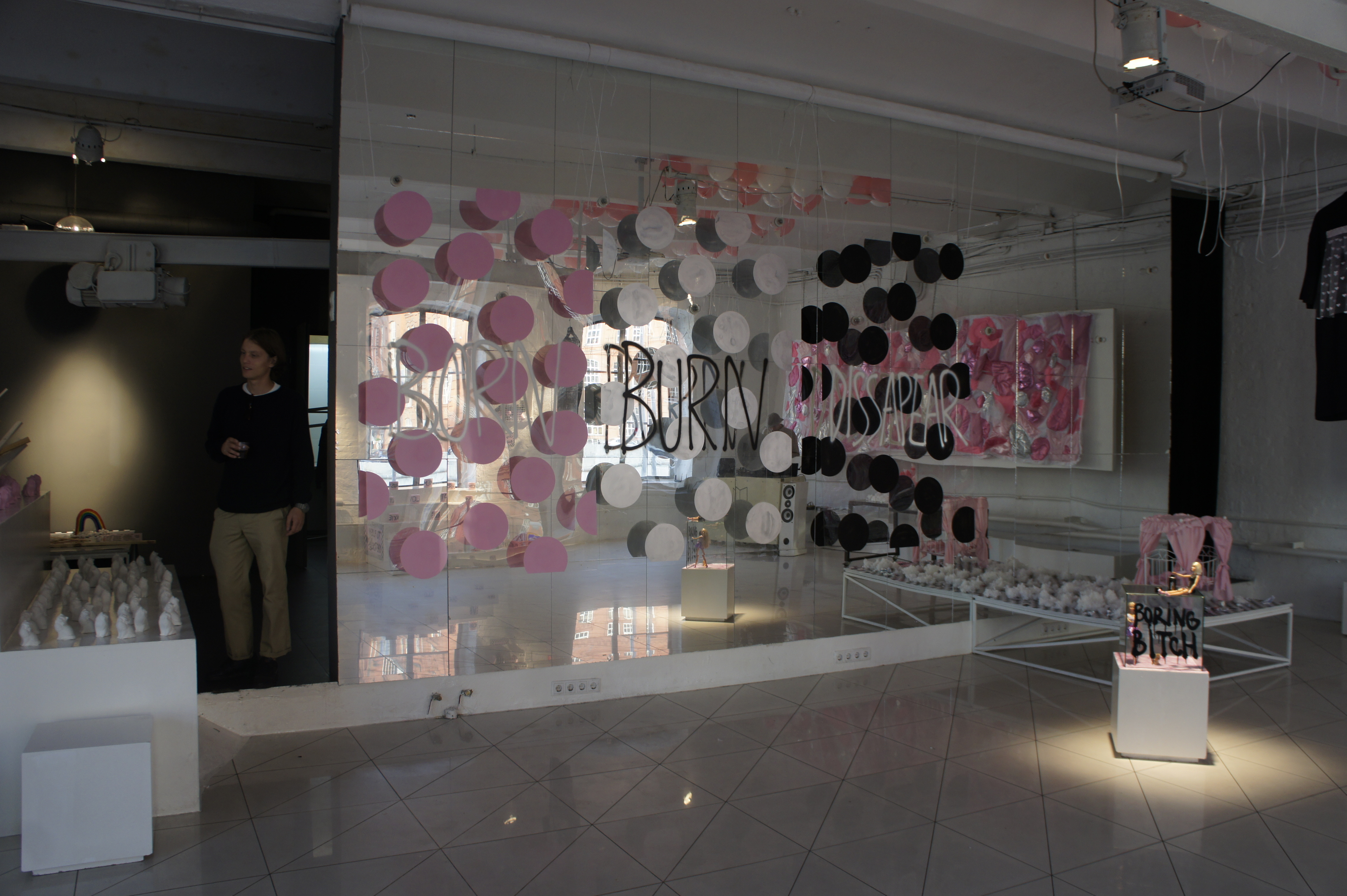 The exposition shows a series of works created especially for the exhibition in 2016. Each object reveals some personal experiences and internal problems of the artist. The works mix tenderness and kitsch with graffiti punk style. Quel: Β«The aim of the exhibition is to find yourself in the modern world, in reality in Moscow in that period of the formation of mixed gender, through the honest disclosure of my relationship to the world through objects. Having a lot of life stages of adolescent from the sucidal thoughts in the inner struggle with religious upbringing that demeans women; through the attempt to understand my own sexual orientation; through the male fascination with painting graffiti on trains; through associations myself with a ska rude girl; through hardcore and techno parties; through the jobs in glossy magazines and attending glamorous parties; through the interest in the last fashion trends, in contemporary arts and the Internet community, to 30 years, strangely enough, I only feel the increasing of teenage sense of protest in me. I notice that things around me and my personal outlook becomes closer to aesthetics of the younger generation who grown up in Vkontakte and Tumblr. I really appreciate a new aesthetics that called "softness as a weapon". This aesthetics is radically in the mood and disparages gender dogmas but it uses the style of pink girlish boudoir, an innocent victim, and gay kitsch coupled with feminist slogans and calls to break the patriarchal pattern. Within the framework of this exhibition, I would like to talk about the complexity of existence in the Russian society a girl with a rebellious heart, but fragile and romantic soul."